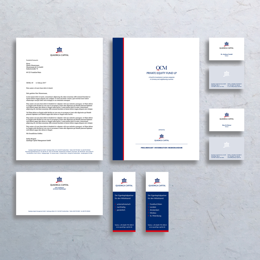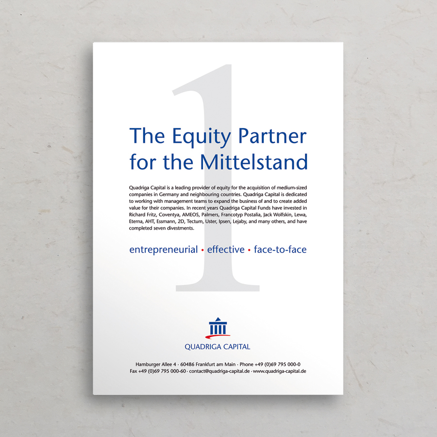Das Unternehmen Quadriga Capital ist als eines der führenden Eigenkapitalhäuser auf den Erwerb mittelständischer Unternehmen in Deutschland und seinen Nachbarländern spezialisiert. Quadriga Capital entwickelt gemeinsam mit den Gesellschaftern und Managern von Familien- und mittelständisch geprägten Konzernunternehmen maßgeschneiderte Nachfolgekonzepte. Der Projektumfang des Corporate Design Projektes umfasste die Entwicklung einer Bild-/Wortmarke, eine Produktmarke, Geschäftspapiere sowie diverse Kommunikationsmittel für jährlich stattfindende Veranstaltungen und Events. Verschiedene Anzeigen und Image-Anzeigen gehören ebenfalls zum Projektumfang.